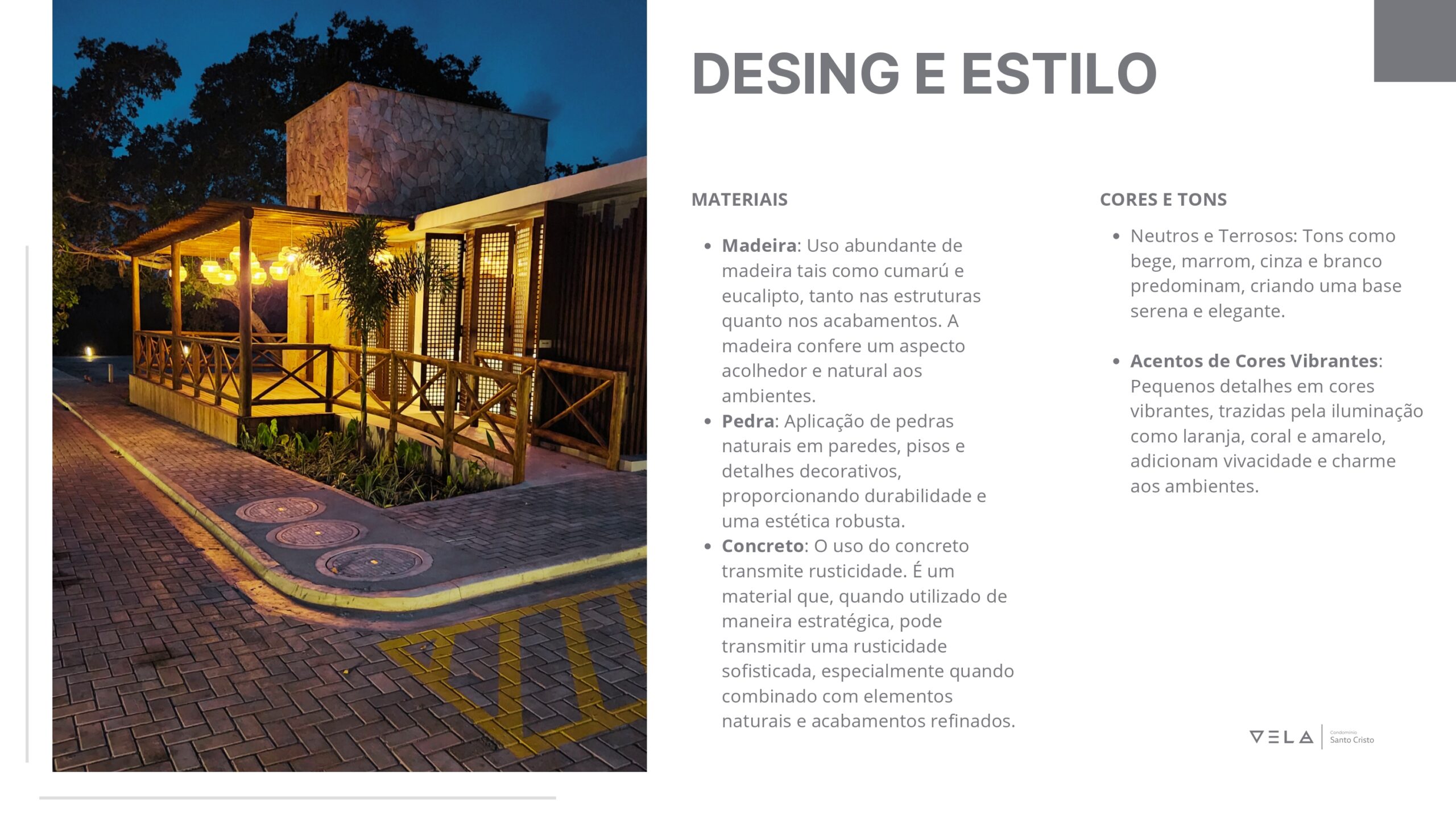 O Vela é um condomínio fechado de lotes de alto padrão, com metragens que variam entre 252m² a 500m², o empreendimento está sendo desenvolvido em uma área de aproximadamente 12 hectares, com 188 metros de beira mar, 2,7 hectares de área verde de proteção permanente (APP) e um cenário paisagístico que privilegia a vegetação nativa da região.